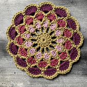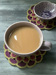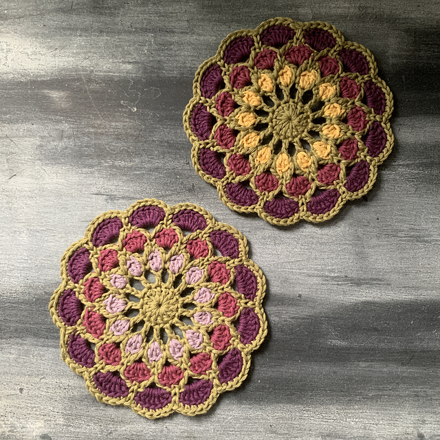 Marigold Mug Mat was designed using 8ply/DK/weight 3 yarn. Meterage used was 38.5 m/42 yds. CC - 19 m/20 yds, MC1 - 3 m/3.2 yds, MC2 - 7 m/7.6 yds, MC3 - 9.5 m/10.3 yds
