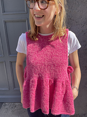 The Dream Vest is worked in three separate parts, the two top panels, the ruffles front and back, and four i-cord strings. First, the front and back top panels are worked individually from the bottom up and then stitched together at the shoulders. Next, the stitches for the ruffles are picked up and knitted top down along the cast-on edge of each, back and front panel. Lastly, four strings of i-cord are knitted and sewn on to tie the vest together at the sides.