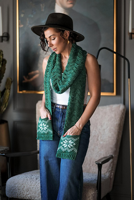 Who doesn’t love pockets? This simple two-row repeat scarf has two pockets that are made by using the waistcoat or knit stitch. The waistcoat stitch is a simple single crochet that looks like it’s knit. The Qanuk (pronounced ka-nook, meaning “snowflake” in Yupik), or snowflake motif, are made by yarn color changes, carrying the unused yarn along the backside of the work.