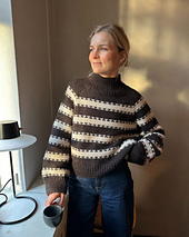 The Key Sweater is worked from the top down with raglan increases on the yoke. Short rows are worked after the neck rib edge to shape the neckline. The body and sleeves are worked in the round and finished with rib edges. The pattern is knitted with a two-colour stripe pattern.