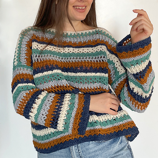 This sweater is a simple and fun project, great for beginners and experienced crocheters alike. It’s made up of four basic pieces: two rectangles for the front and back, and two for the sleeves. Crocheted from the bottom up with a mix of stitches, it creates relaxed stripes that are easy to follow.