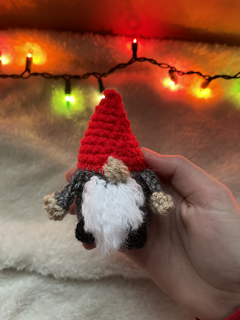 this is a free pattern for a 4 inch gnome. the feet, hands, and nose are made with bobble stitches and the only sewing is to attach the arms to the body.