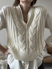**TULIP_LOOP_VEST** is a loose-fitting v-neck vest, detailed with ribbing and cables.