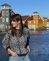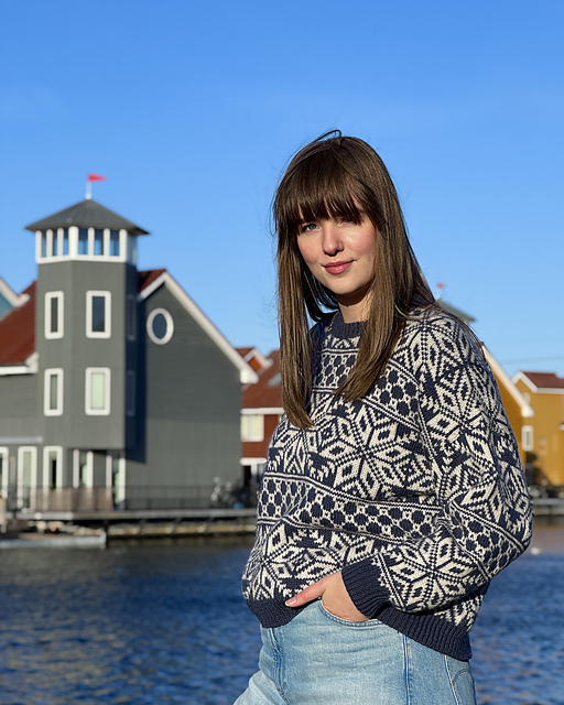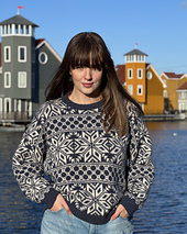 The **Lillehammer Pullover** is an all-over stranded colourwork pullover, with a 80s inspired oversized fit and a dropped shoulder construction. The largest sizes have modified dropped shoulder construction for a better fit. The pattern is calculated to have around 30 cm of positive ease, with large sleeves to complement the silhouette. The entire pullover is knitted in the round and uses steeking to make that possible. The body is worked bottom-up, adding steek bridges for the sleeves and the front neck where necessary. After cutting the steeks, the collar is added and the sleeves are worked top down.