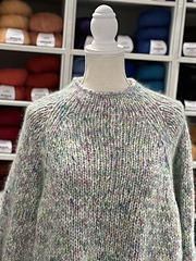 The sweater is knitted entirely in the round with a beginner-friendly top-down raglan method.