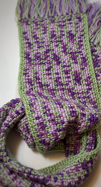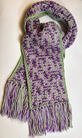 The pattern and photo/video tutorials outline how to make a sample, or gauge square, and how to make the scarf, which is sized appropriately for elementary school-aged children. There are instructions for how to adjust the size of the scarf if you want to make a longer one for an adult.