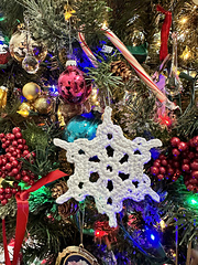 This is a quick crochet snowflake that can be hung on a Christmas tree as an ornament, or hung in a window as a winter decoration.