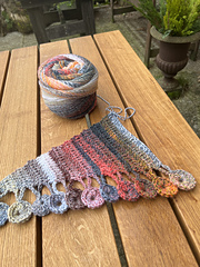 A cute, playful shawl that is crocheted from one side to the other.
