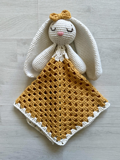 This pattern is only for the stuffed part of the toy. It does not include instructions for the blanket. You can make a 40x40cm blanket of your choice to attach to the bunny.