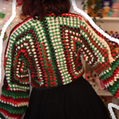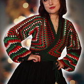 Hexi Wrap is a take on the classic Hexagon Cardigan, with puffy sleeves, a ribbed hem and straps to wrap it around your waist, creating a super flattering silhouette, whilst also being accessible and adjustable.