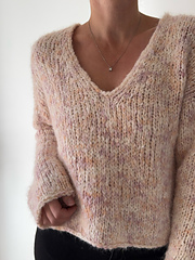 Twofold Sweater is a classic v neck, slightly oversized drop shoulder style pullover. Constructed from the top down starting with the back. Two strands of super fluffy and light yarn are used to create this sweater with the intention to create something warm, but light to wear. Sweater features a neat shoulder detail and a simple bind off that resembles a braid around the neck, waist and sleeve cuffs. 10 to 20 cm / 4” to 10” of positive ease is built in to the pattern, choose your size based on how much ease you prefer.