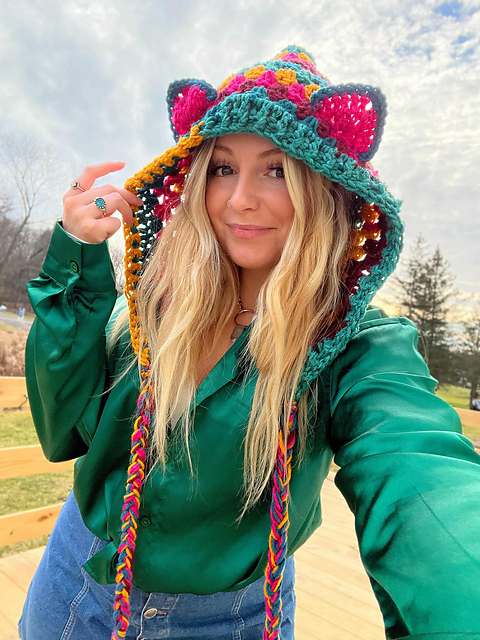 The Fairy Beary Hood is a relatively simple design. It features granny cluster stitches, and can be made-to-measure. It depends on your starting chain for either a child or adult. You can create a fitted hood or an over-sized one. Feel free to use any weight yarn and hook size for this project, I've had testers create this same design using chunky yarn and it turned out beautiful.