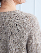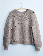 Novita Halaus (40 % Cotton, 35 % Alpaca, 25 % Wool, 50 g / 109 yds / 100 m / skein). You need 7 (7, 8, 9, 9, 10) (10, 11, 11, 12, 13, 13) skeins or 706 (766, 872, 939, 969, 998) (1058, 1116, 1176, 1265, 1325, 1385) yds / 648 (703, 800, 862, 889, 915) (970, 1024, 1079, 1161, 1216, 1271) m of similar yarn. Color 6011 Henkäys (sand brown).
