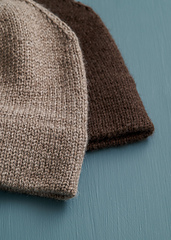 - 1 (1, 2, 2, 2) skein(s) of Purl Soho’s [Simply Yak][1], 100% yak yarn. Each skein of this light worsted/dk-weight yarn is 109 yards/ 50 grams; approximately 75 (95, 135, 170, 200) total yards required. We used Natural Taupe and Natural Brown.