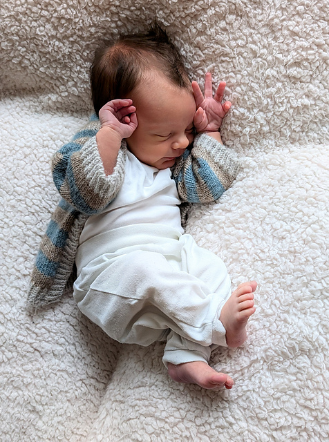 Measurements given are for the finished cardigan. Size 1 fits a newborn, up to size 4 for a 1.5 year old baby.