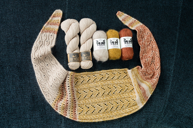 *This small shawl is knit sideways starting with an I-cord Tab Cast On. Increases along one edge with corresponding decreases gradually shape the fabric into a thin little scarf. Two skeins (100g total) of West Wool Bicycle are used throughout the pattern along with three shades of West Wool Glowhair. The lace weight mohair colors are marled together with the fingering weight wool to create a frothy halo. I recommend choosing a gradient of three colors for the lace weight mohair contrast colors.*