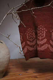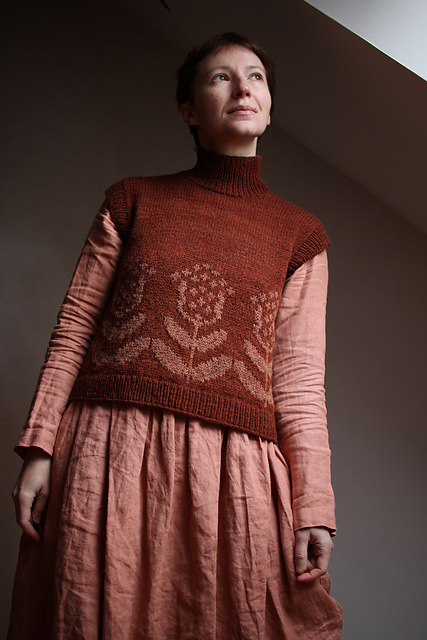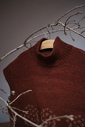 The vest is knit bottom up, partially in the round and flat. An alternative chart for those looking to avoid long floats is provided. The garment has an A-line shaping of the body and english tailored shoulders.