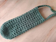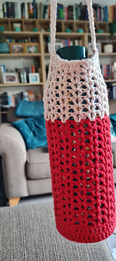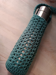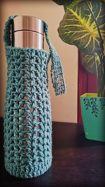 The pattern for a water bottle holder is easy and the size is adjustable. The pattern is made to fit a standard water bottle with the base measuring a diameter of 8 cm/3 inches. However, if you want to make it bigger you can increase the number of rounds at the base. The length of the strap can also be adjusted.