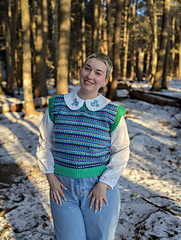 With 2” (5 cm) of ease in the body and armhole depth, this vest has a relaxed yet polished fit—not too oversized, not too snug—just right! You can use any weight of yarn in any color sequence you like, whether you prefer a structured stripe pattern or complete chaos (in the best way).