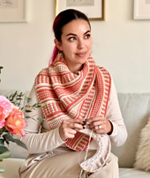 The piece is knit flat from the back neck towards the wide front section and shaped with increases. The edges are polished with built-in i-cord that is continued in the two-color i-cord bind off, video tutorial provided. Colors are carried along the edge and hidden in the i-cord edging, so there's **no yarn cutting** and just a couple of ends to weave in in the end! Mosaic stitch patterns are both charted and written out.