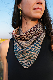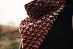 **Design & Construction:** The Sisterhood Cowl is an all-over textured mosaic cowl that is knit flat from the bottom up. Increases are worked to form a triangular shape and then the piece is knit even until the intended neck length is achieved. The finished cowl is seamed using mattress stitch. I-cord selvages and a 2-color i¬-cord bind off create polished edges.