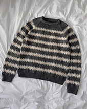 The Key Sweater Man is worked from the top down with raglan increases. Short rows are worked after the neck rib edge to shape the neckline. Sleeves and body are worked in the round and are finished with rib edges. The sweater is worked in a two-color stripe pattern.