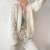 The Plumes Cardigan is designed with elegant lace stitches that form a feather-like motif, creating a beautifully draped and flowing fabric. It features a wide ribbed section along the front and sleeve cuffs for a polished finish.