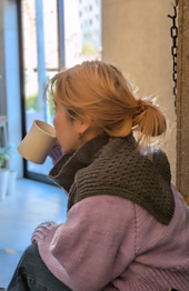 此款设计是分别从下往上编织前身片和后身片,途中领口处先休止,左右分开编织肩部。肩部使用德式引返 (German Short Rows)。肩部缝合处采用三针伏针收针 (3-Needle BO)。领口最后挑针进行圈织。