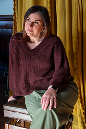 This sweater is intended to be worn with 4–8" / 10–20 cm of positive ease. Select a size 4–8" / 10–20 cm larger than your chest circumference. Measurements below are for the finished sweater after blocking. Samantha wears Size 5 with full sleeves and +6.25" / 16 cm of positive ease; she is 5’6" / 167.5 cm tall.