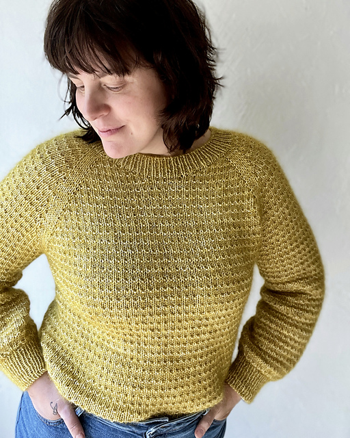 The sweater is knitted in one piece, starting from the neckline and without seams. Its straight cut and raglan arms make it a very comfy garment. The waffle stitch pattern used brings a nice touch of texture to this unisex and timeless design.
