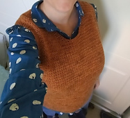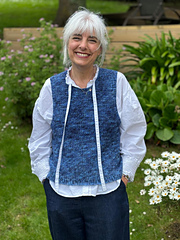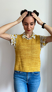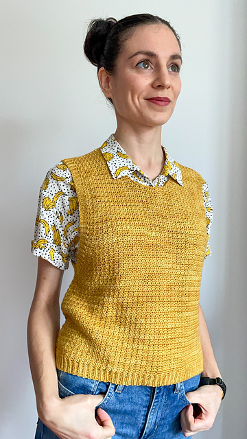 Este es un patrón a ganchillo tejido de arriba hacia abajo. Está tejido en plano comenzando por el canesú trasero. A continuación se tejen los hombros y el canesú delantero y por último el cuerpo uniendo las pasadas con un PD. Para finalizar, se tejen bordes elásticos en los brazos y el bajo del chaleco y un borde de punto cangrejo para el cuello. No tiene costuras.