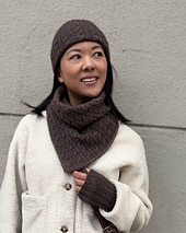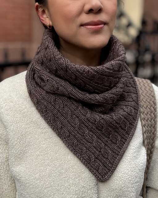 Elevate your cold-weather wardrobe with the Cityscape collection. Classic cables, reimagined with a contemporary touch. The **Cityscape Cowl** is an asymmetrical cowl featuring a timeless cabled pattern and polished i-cord edging. It is worked flat on a bias and then seamed. This pattern includes charted and written instructions. This softly sophisticated & stylish cowl is a joy to knit and wear again and again!