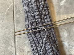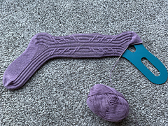 This pair of socks is knit in one piece from the toe of the first up to the cuff, a stitch is marked to cut later and then the “second” sock is knit down to the toe. After grafting the second toe, the socks are separated and a decorative bind off is used on both socks at the cuff.