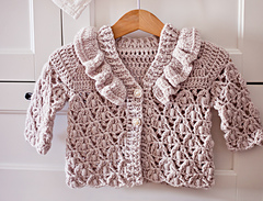 Ruffle Cardigan is worked top down with a v-neck. Completely seamless. It's fun to make and will be perfect for your little one's spring wardrobe!