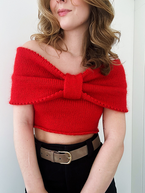 It's almost become a tradition for me to knit my Christmas outfit - or can you call it a tradition if you've only done it twice? Well, maybe not. But the 2024 Christmas outfit had to be knitted, just like in 2023, and that's when this design was born. I wanted to make a top that I could style together with a skirt and had been inspired by the bows that had become so popular to decorate with - both on clothes, in the hair, on the Christmas tree and on the dining table. The bows were everywhere - and I wanted one on my Christmas outfit. That's how the idea of making a bow top was born. But I also wanted to make a versatile garment that I could use for more than just my Christmas outfit, and that's when I came up with the idea of making a 2 in 1 top. The bow top simply consists of two ribbons - the yoke and a slightly smaller double-knit ribbon that you attach around the top to create a beautiful bow. Remove the ribbon and you have an off-shoulder top that can be worn with elegant fancy outfits or everyday with a shirt underneath and a pair of jeans.