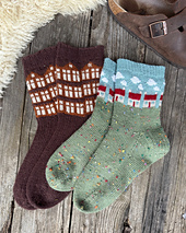 This whimsical home inspired colourwork sock pattern set, includes **two** sock patterns. One inspired by a charming cottage in the countryside with big rolling skies and fluffy clouds and the other of nostalgic wooden chalets in the mountains. These sock patterns are for knitters who are long for the comfort of their home (and their knitting projects!) when they are out and for those who dream of living or visiting places like these.