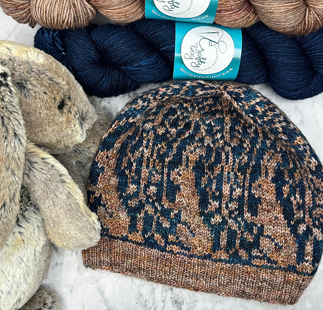 The Bunny Wishes Hat was designed as a complementary accessory to the Bunny Wishes Mittens and Bunny Wishes Sock patterns. These sweet little bunnies, snuggled in the foliage and blowing their dandelion wishes into the air are sure to delight you and keep you wanting to finish one more row.