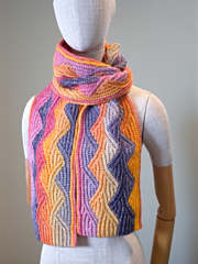It works vertically, flat, and in one piece. Repeats of the stitch pattern are structured to create a double-sided scarf textile. Both sides are right sides, a tiny bit different, but both are outstandingly beautiful.