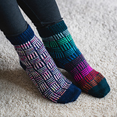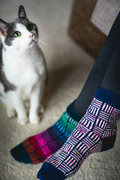 The Tally Alley Socks use a series of parallel lines in opposite directions to create a basket-weave effect. This is a fun motif to play around with contrast and color pairings, and it's a great way to use up some of that sock stash!