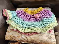 Frost Nipper is a swirly cowl that provides warmth as temps fall. Wear it over a plain top to dress it up or under a coat to block drafts. Crocheted from the top down in an easy-to-hook swirl pattern of dc and shells with a shell collar that is added at the end. The cowl is make with 230 yards of DK/light worsted weight yarn with a size I (5.5mm) crochet hook. Finished size is 22" around neck x 11" long x 58" around bottom. Make it in one color, several colors, scrap yarn, or a yarn with a long color run. An added bonus are instructions for turning the cowl into a longer shoulder hugger or a poncho with extra yarn. The 5 page pattern has written row instructions and two crochet charts.