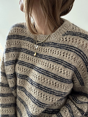 The sweater is worked from top to bottom. Stitches are first casted on for the back piece, which is worked back and forth with short rows to shape the upper back. Then stitches are picked up along the shoulder edge and the shoulders are worked back and forth individually. The 2 shoulders are joined for the front piece by casting on stitches. The front and back piece are joined for the body, which is worked in the round and finished with a ribbing edge and Italian bind off. Neck stitches are picked up along the neckline and worked in the round in ribbing. For a lovely finishing touch, the last four rounds are worked in double knitting, followed by Italian bind off. Sleeve stitches are picked up around the armhole and sleeves are worked individually in the round, finished with a ribbing edge and Italian bind off. Stripes and eyelets are worked according to a chart throughout the whole sweater. The first part of the pattern describes the chart row-for-row.