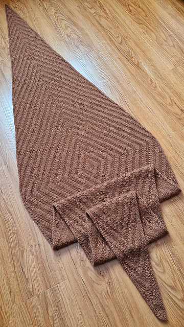 Es ist ein langes, seitlich gestricktes Tuch. Man beginnt an einer Spitze und arbeitet sich dann zur gegenüberliegenden Spitze vor. So wird eine längliche Rhombus-/Rauten-Form erzeugt.