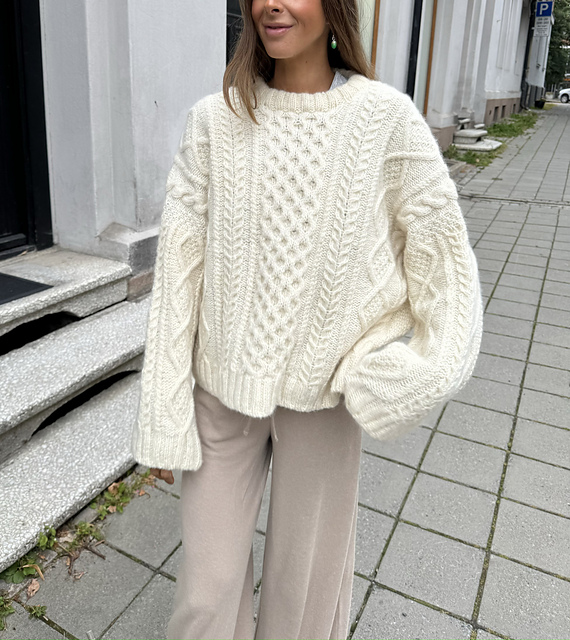 The Frøya Sweater is an oversized aran sweater worked top-down. It’s been developed over time to achieve the perfect fit, inspired by the idea of creating the ultimate Aran/fisherman-style dream sweater. With its high-quality yarn and timeless design, this is a sweater that can be passed down through generations without ever going out of fashion. First, the back is worked back and forth, with increases shaping the drop shoulders. Stitches are picked up for the shoulders and joined to form the front. The front is also worked back and forth, then joined with the back to create the body. The stitches for sleeves are picked up and sleeves are worked in the round. The neckline is finished with a ribbed edge that is folded double.