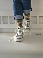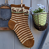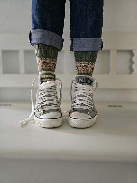 31 sts / 48 rnds = 10 cm (4“) square, worked in the round in stockinette stitch, using one colour only, after washing and blocking. Measured on a sock blocking board.
