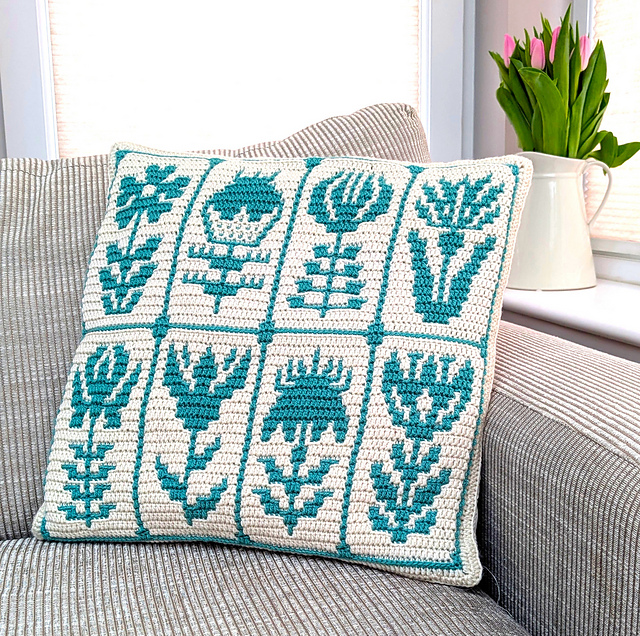 Petal Party is a simple floral design with eight different flower patterns that can be arranged in many ways and used to make lots of different projects. You will also get access to an online interactive tool to help you arrange the flowers in the way you want. The pattern includes chart and written instructions to make the cushion cover and eight individual flower charts and instructions for you to use in any way you want.