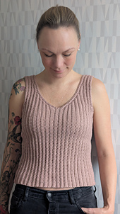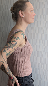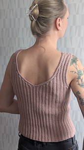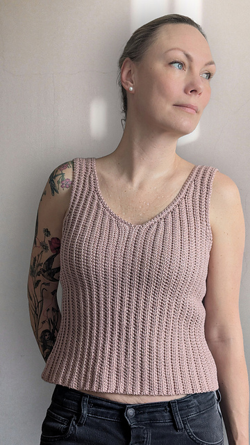 Vernalis is a simple tank top in vertical rows of half doubles in back loops. Shaped with short rows, it is crocheted in one piece and sewed together at the side and shoulders.