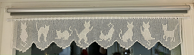 * In the even rows: one long space (length of two connected spaces): 8 ch (3ch= 1 dc at the beginning of the row, the top most part of the curtain + 5 for the free space), 1 dc