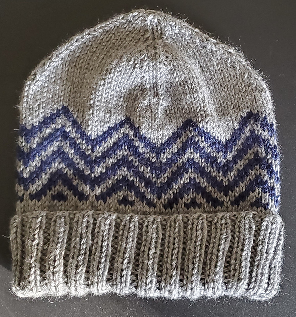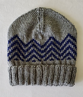 Yarn selection is knitters choice - two colors of their choosing. Both colors require less than a skein. The hat in this pattern uses Caron Simply Soft in grey as the main color and dark country blue for the accent color.