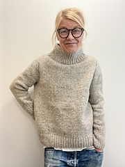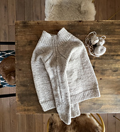 After the high neck is complete, a few short rows are worked back and forth to create a slightly higher back neck. The yoke is worked in the round with contiguous set in sleeves (developed by Susie Myers) to sleeve separation. The body is then worked in rounds down to the ribbing. Sleeves are worked top down to the long cuffs last. No finishing required.