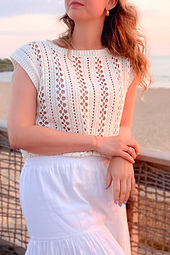 The top is made from two body panels worked from side to side using a repetition of two clusters of stitches that create the lace pattern. They only consist of chains, single and double crochet stitches.